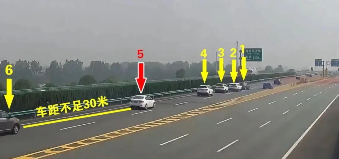 随后又一辆小车(5号车)行至此处,及时发现情况向右避让。而紧随在后的姚某驾车(6号车)未保持安全车距,在5号车变道后才突然发现前方情况,猝不及防之下接连撞上前方4、3号两辆车。万幸事故仅造成三车受损、三人轻微伤。